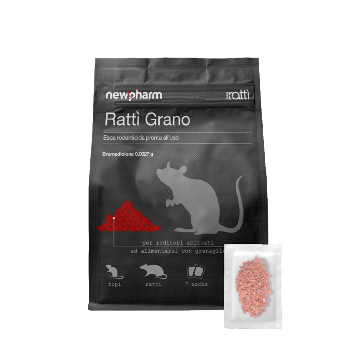 RATTÌ GRANO è una soluzione specifica per il controllo di topi e ratti, composta da grani appetibili e confezionati in pratiche bustine. L'esca, a base di Bromadiolone, agisce con efficacia senza destare sospetti all interno della colonia di roditori. Prodotto biocida destinato ad un impiego professionale e domestico, offre sicurezza grazie all utilizzo in contenitori resistenti alle manomissioni. Modalità d uso chiare garantiscono risultati affidabili sia in ambienti interni che intorno agli edifici.
