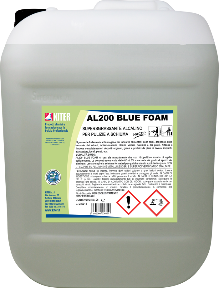 AL 200 BLUE FOAM è uno sgrassante fortemente schiumogeno con elevata alcalinità, indicato per la rimozione di grassi e residui organici in industrie alimentari e ambienti HACCP. Adatto a piani di lavoro, attrezzature e superfici verticali. Utilizzabile manualmente o con idropulitrice, è compatibile con acciaio inox, vetro, gomma e cemento. Prodotto destinato esclusivamente a operatori professionali. Confezione tanica da 25 kg.