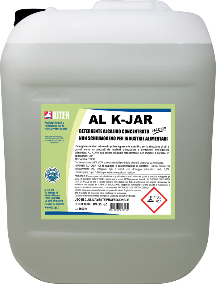 AL K-JAR è un detergente alcalino concentrato non schiumogeno per uso professionale. Svolge azione disinfettante battericida, fungicida e virucida. È adatto per la pulizia profonda di superfici, attrezzature e pavimenti in settori alimentari, sanitari e pubblici. Rimuove efficacemente oli e grassi, facilita il risciacquo e riduce residui calcarei. Utilizzare con dispositivi di protezione. Presidio Medico Chirurgico Reg. 19761.