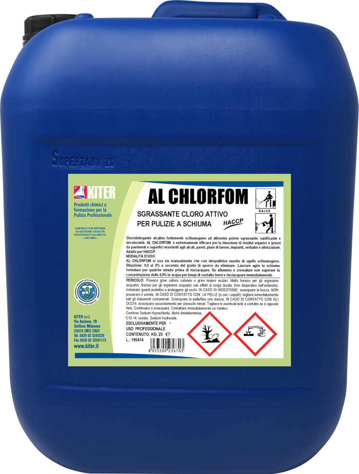 AL CHLORFOM è un clorodetergente alcalino schiumogeno a base di cloro, specifico per pulizie professionali. Garantisce un’efficace azione sgrassante, igienizzante e decolorante su superfici anche verticali grazie alla schiuma persistente. Ideale per l’industria alimentare, rimuove grassi, proteine e macchie organiche lasciando le superfici pulite e brillanti. Utilizzare indossando dispositivi protettivi. Tanica da 23 kg.