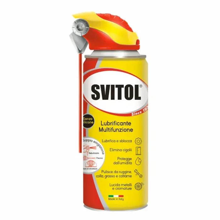 Svitol Super Spray 400 ml di Arexons è un lubrificante a base di oli sintetici e additivi antiusura, progettato per ridurre l'attrito e penetrare in profondità. Protegge nel tempo arrestando la ruggine e si distingue per la sua azione efficace su molteplici superfici, come vetri e componenti multiuso. Il pratico doppio erogatore facilita l'applicazione, garantendo risultati affidabili grazie alla qualità Arexons.