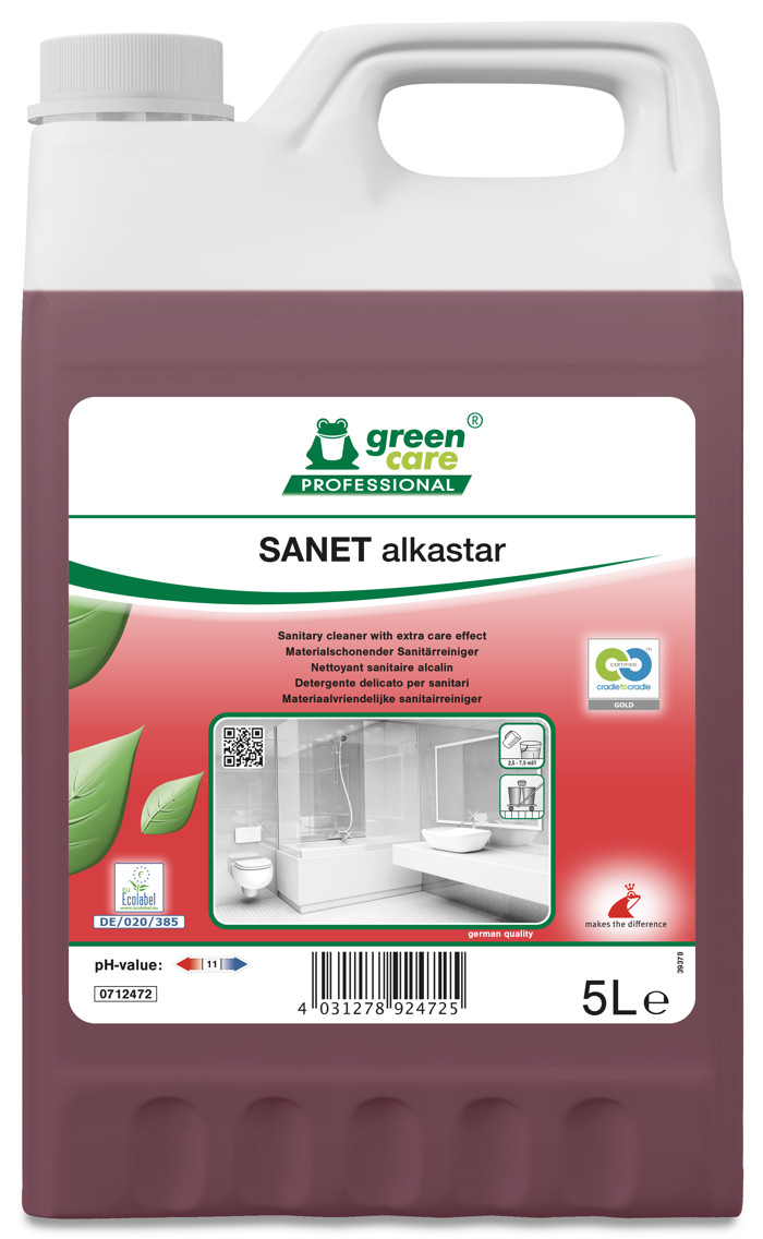 SANET ALKASTAR lt. 5 è un detergente alcalino privo di acidi e cloro, ideale per la cura e la manutenzione dei sanitari. Studiato per l'uso professionale, garantisce un'azione efficace contro lo sporco grasso, offrendo elevate prestazioni già a basse concentrazioni. Formulato con materie prime di origine vegetale, è certificato Ecolabel e Cradle to Cradle Gold, garantendo un impatto ambientale ridotto e sicurezza per l'operatore.