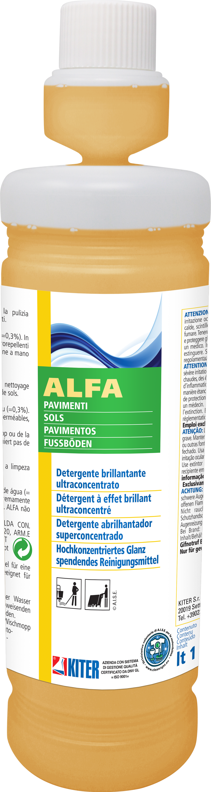 Alfa Flacone Dosatore 1L è un detergente lavapavimenti a pH neutro, ultraconcentrato e a base alcolica, ideale per l’igiene quotidiana di ogni superficie dura. Non fa schiuma, asciuga rapidamente senza lasciare aloni, garantendo un gradevole profumo agrumato intenso e duraturo. Pratico da usare con mop e lavasciuga, semplifica le operazioni di dosaggio limitando sprechi e costi di magazzino. Adatto a tutti i pavimenti, per uso esclusivamente professionale.