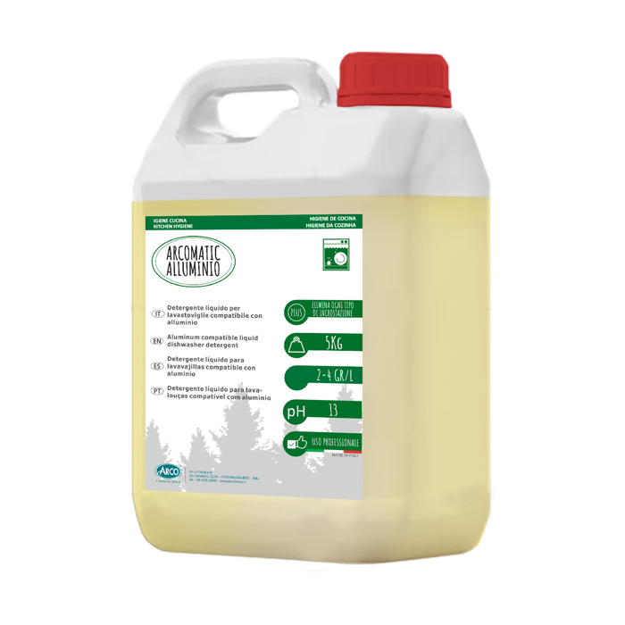 ARCOMATIC ALLUMINIO è un detergente liquido professionale per lavastoviglie, indicato per stoviglie e pentolame in alluminio. Privo di cloro, offre una buona resa anche con acque dure. Da usare manualmente o tramite dosatori automatici, pulisce a partire da 50°C. Tanica da 5 kg. Consultare la Scheda di Sicurezza prima dell’uso. Ingredienti conformi a Reg. CE 648/2004. Solo per utilizzo professionale.