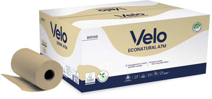 L'asciugamano in rotolo A7M Natural è realizzato con materie prime di recupero dal Tetra Pak, certificato Ecolabel e FSC Recycled. Offre resistenza grazie ai due veli incollati e microgoffratura. Ogni rotolo ha una lunghezza di 70 metri e una larghezza di 228 mm, ideale per ambienti professionali che richiedono affidabilità e attenzione all’ambiente. Il prodotto è adatto anche per il contatto con alimenti secchi.