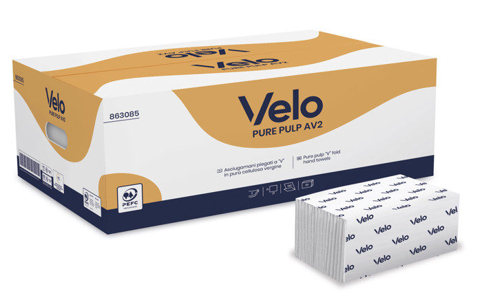 Asciugamano piegato a V2 realizzato in pura cellulosa certificata PEFC, ideale per ambienti che richiedono praticità e massima igiene. Il design con doppio velo e goffratura raffinata assicura alta capacità assorbente e comfort. La piegatura a V facilita l'estrazione singola, ottimizzando i consumi. Il colore bianco e il grado di bianco superiore all'82% garantiscono un aspetto pulito e ordinato in ogni contesto professionale.