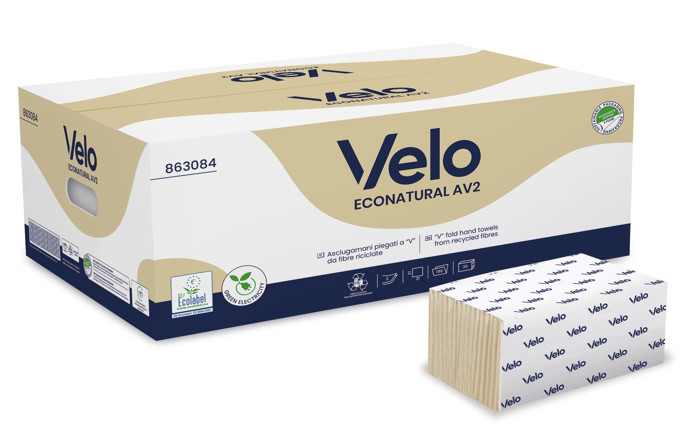 L'asciugamano piegato a V2 Natural, realizzato in Fiberpack riciclato da Tetra Pak e certificato Ecolabel, è pensato per garantire praticità e attenzione all'ambiente. Caratterizzato dal colore avana naturale, offre una doppia resistenza grazie ai due veli incollati e misura 210x210 mm. Ideale per aziende, strutture ricettive e contesti ad alto traffico, assicura un'asciugatura efficace nel rispetto dei requisiti ecologici europei.