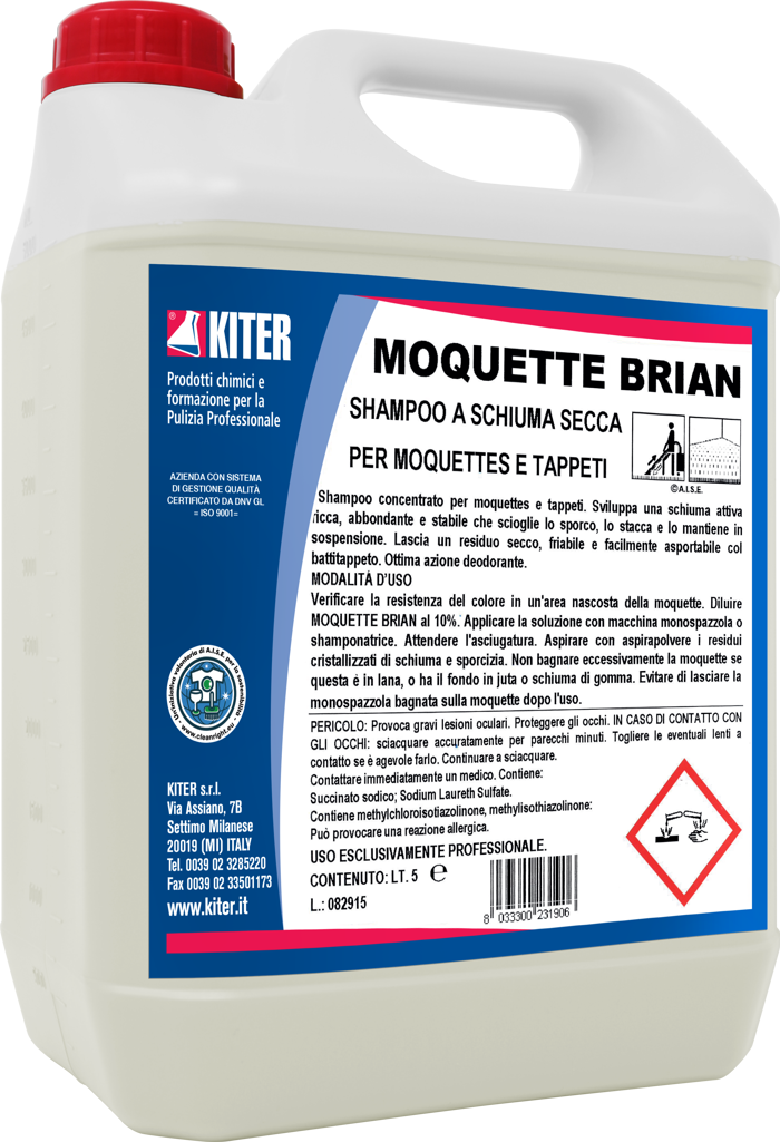 BRIAN MOQUETTE è uno shampoo a schiuma secca per la pulizia di moquette e tappeti. Grazie alla schiuma ricca e durevole, rimuove a fondo lo sporco lasciando un residuo secco facilmente eliminabile con battitappeto o aspirapolvere. Contribuisce a mantenere i tessuti puliti più a lungo e dona una piacevole fragranza floreale. Prodotto professionale, indicato sia per lavaggi frequenti sia per trattamenti intensivi.