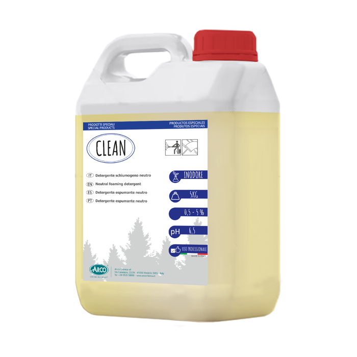 Detergente schiumogeno neutro inodore, ideale per la pulizia professionale di attrezzature nel settore alimentare e superfici dure. CLEAN rimuove sporco ostinato grazie alla sua formulazione concentrata ad effetto emulsionante. Indicato per affettatrici, banchi da lavoro e tritacarne, è efficace anche su vetri o come shampoo per autovetture. Adatto a tutte le superfici, non lascia odori residui. Uso professionale. Consultare la scheda di sicurezza prima dell’utilizzo.