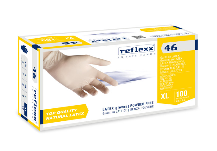 Guanti usa e getta in lattice naturale Reflexx 46 privi di polvere, dotati di superficie microruvida e clorurati per ridurre il rischio di allergie. Offrono sensibilità e comfort durante le attività di pulizia, mantenendo mani protette e limitando la contaminazione. Conformi alle principali norme di sicurezza, sono idonei anche al contatto alimentare. Ogni confezione contiene 100 pezzi. Disponibili in diverse taglie per adattarsi a ogni esigenza.