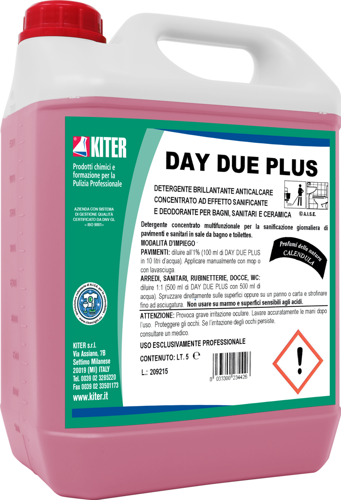 DAY DUE PLUS tan.5 lt. è un detergente concentrato anticalcare e brillantante con profumazione alla calendula. Ideale per la pulizia quotidiana di bagni, sanitari e superfici in ceramica. La sua formula garantisce una profonda azione igienizzante e deodorante, lasciando gli ambienti freschi e privi di calcare. Adatto per l’uso professionale in comunità e ambienti pubblici. Non usare su marmo e superfici delicate agli acidi.