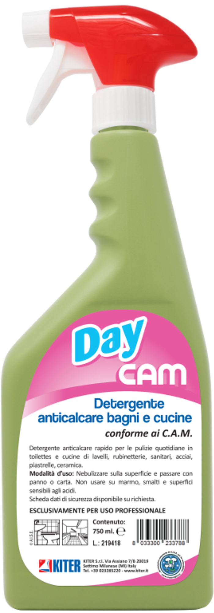Day Due Cam 750 ml è il detergente anticalcare ideale per la cura quotidiana di bagni e piastrelle. Rimuove calcare e aloni da sanitari, rubinetterie, lavelli, vasche, docce e superfici in acciaio, lasciando un gradevole profumo di calendula. La sua formula non corrosiva, adatta all’uso professionale, previene le incrostazioni e garantisce risultati brillanti senza risciacquo. Non lascia striature e rispetta cromature e acciai satinati.