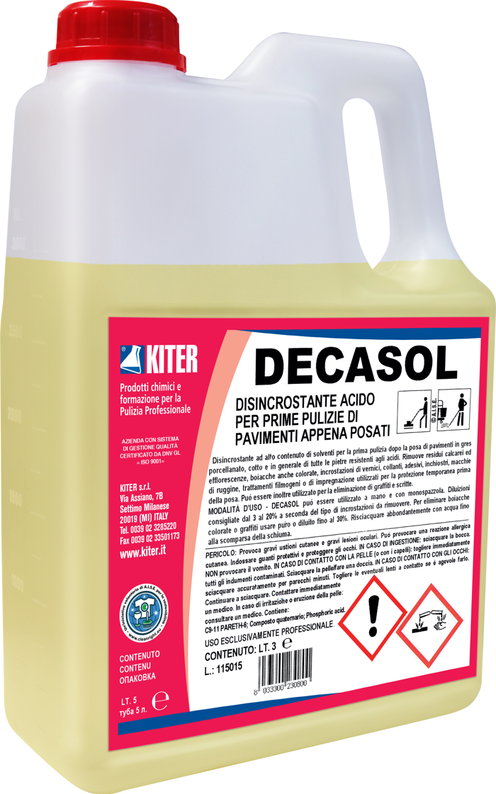 Decasol tanica da 3 litri è un disincrostante acido per la pulizia iniziale di pavimenti in gres porcellanato, cotto e superfici resistenti agli acidi. Ideale per eliminare efflorescenze, boiacche colorate, residui di collanti e trattamenti filmogeni. Prodotto professionale da utilizzare con dispositivi di protezione. Utilizzabile manualmente o con monospazzola, garantisce la rimozione efficace delle incrostazioni più persistenti.