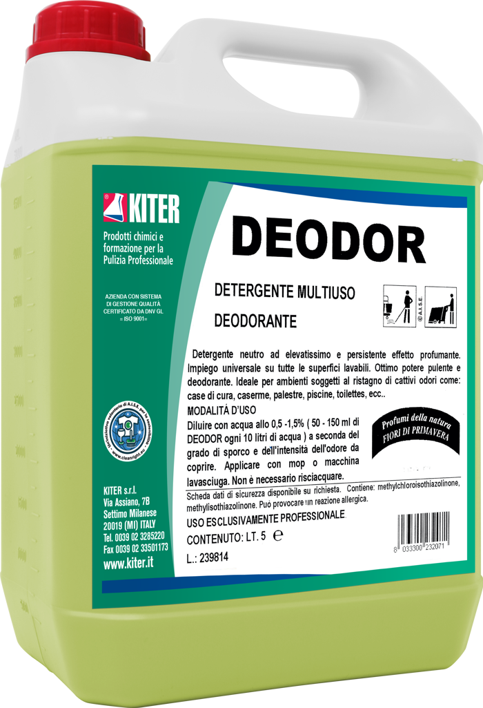 DEODOR tanica da 3 litri è un detergente neutro multiuso concentrato, ideale per la pulizia quotidiana di pavimenti e superfici dure in ambienti soggetti a cattivi odori come case di cura, comunità, caserme e spogliatoi. La sua profumazione persistente Fiori di Primavera assicura freschezza duratura. Non lascia residui e non richiede risciacquo se utilizzato correttamente. Progettato per impieghi professionali.