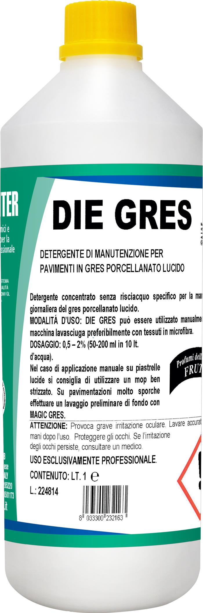 DIE GRES è un cristallizzatore rapido specifico per marmi, graniglie e superfici calcaree. Rinnova la brillantezza originale, elimina la porosità e facilita la manutenzione quotidiana. Utilizzabile anche su gres porcellanato lucido, ceramica e granito, impedisce la formazione di aloni e macchie calcaree. Asciuga velocemente senza lasciare residui e limita l’assorbimento dello sporco. Solo per uso professionale.