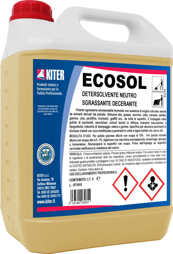 ECOSOL tanica 5 litri è un detersolvente neutro sgrassante e decerante ideale per la rimozione di grassi, colle, vernici e cere da pavimenti in legno e cotto trattati. Grazie alle sue componenti di origine naturale e al profumo agrumato, ECOSOL assicura una pulizia efficace rispettando le superfici. Privo di solventi idrocarburici e fosfati, garantisce sicurezza ed elevata biodegradabilità. Utilizzo riservato a operatori professionali.