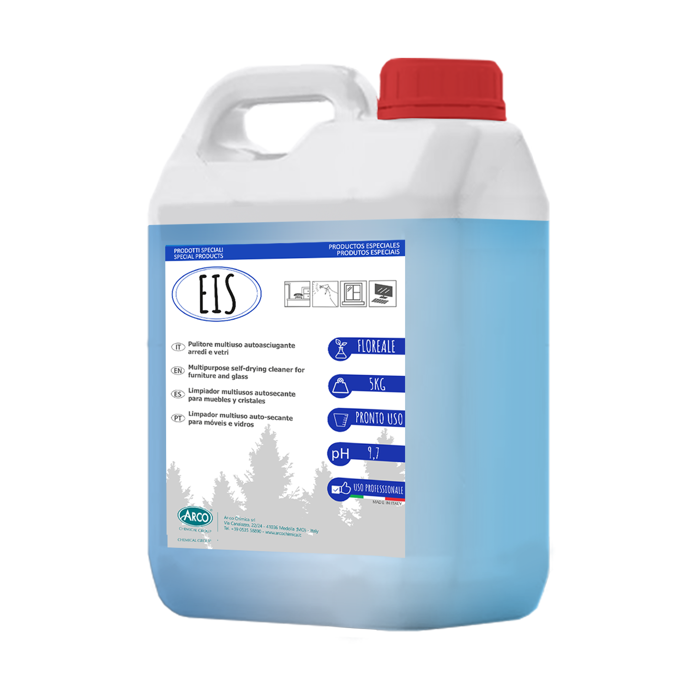 EIS detergente multiuso autoasciugante in tanica da 5 kg, ideale per la pulizia quotidiana di vetri, specchi, scrivanie, plastiche lavabili, superfici laccate, telefoni e computer. Rimuove rapidamente macchie di unto, segni di penne e pennarelli senza lasciare aloni e non necessita di risciacquo. La sua profumazione fiorita dona freschezza agli ambienti. Formulazione pronta all’uso specifica per il settore professionale.