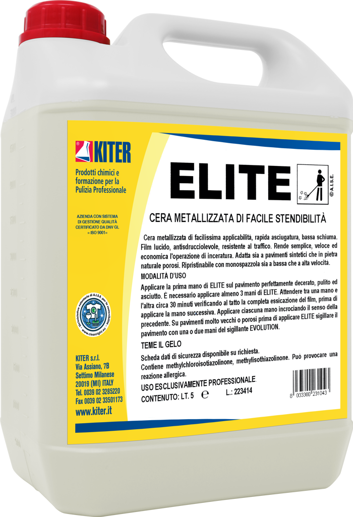 ELITE tanica 5 litri è una cera metallizzata rapida, ideale per la protezione e finitura di pavimenti sintetici o in pietra. Offre una stesura scorrevole, asciugatura veloce e una brillantezza uniforme. Garantisce una superficie resistente a traffico intenso e segni, con effetto antisdrucciolo. Si applica su superfici perfettamente pulite e asciutte. Utilizzo riservato a professionisti. Prodotto da Kiter S.r.l., conforme alle normative vigenti.