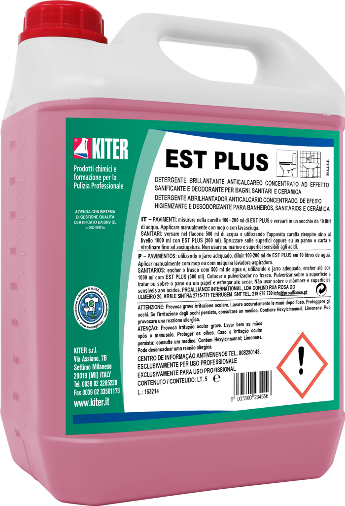 EST PLUS è un detergente concentrato profumato pesca-albicocca per superfici come ceramica, gres, rubinetterie e sanitari. Garantisce igiene quotidiana e previene la formazione di calcare. Ideale per bagni in ambienti professionali, lascia le superfici brillanti e perfettamente deodorate. Il prodotto, completamente solubile in acqua, è destinato all’uso esclusivamente professionale e non adatto su marmo o superfici sensibili agli acidi.