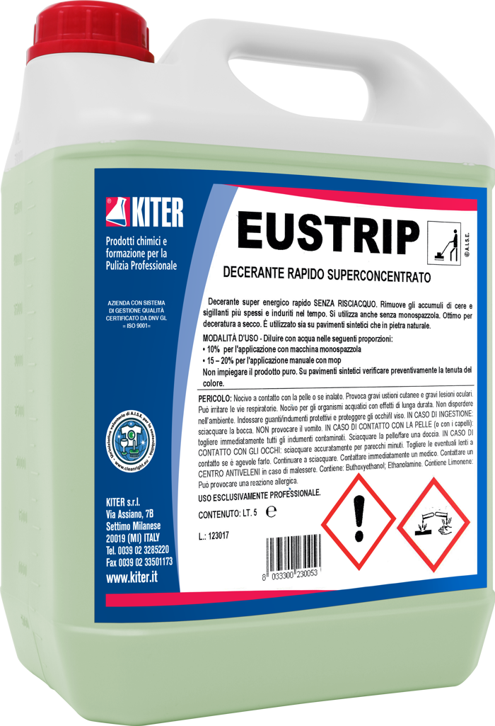 EUSTRIP tanica 5L è un decerante rapido senza risciacquo, indicato per la rimozione efficace di cere e sigillanti da pavimenti sintetici e in pietra naturale. La formula, priva di ammoniaca e sostanze altamente caustiche, agisce in modo rapido anche per decerature a secco o uso manuale. Non lascia residui e facilita la successiva applicazione di nuove cere. Per uso professionale. Si consiglia l’uso di dispositivi di protezione individuale.