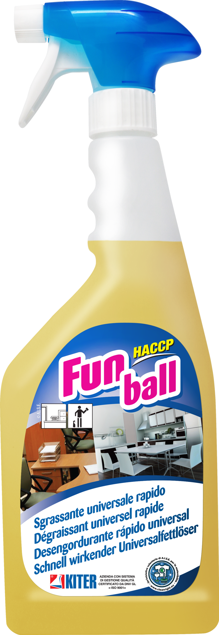 FUN BALL ML.750 è uno sgrassante professionale senza risciacquo, adatto per una pulizia rapida di superfici lavabili soggette a sporco stratificato, unto, inchiostri, pennarelli, graffiti e residui carboniosi. Ideale per ristorazione collettiva e ambienti alimentari, lascia le superfici lucide e senza residui. Utilizzabile puro o diluito, agisce in profondità su piastre, forni, griglie, pavimenti e arredi tessili.