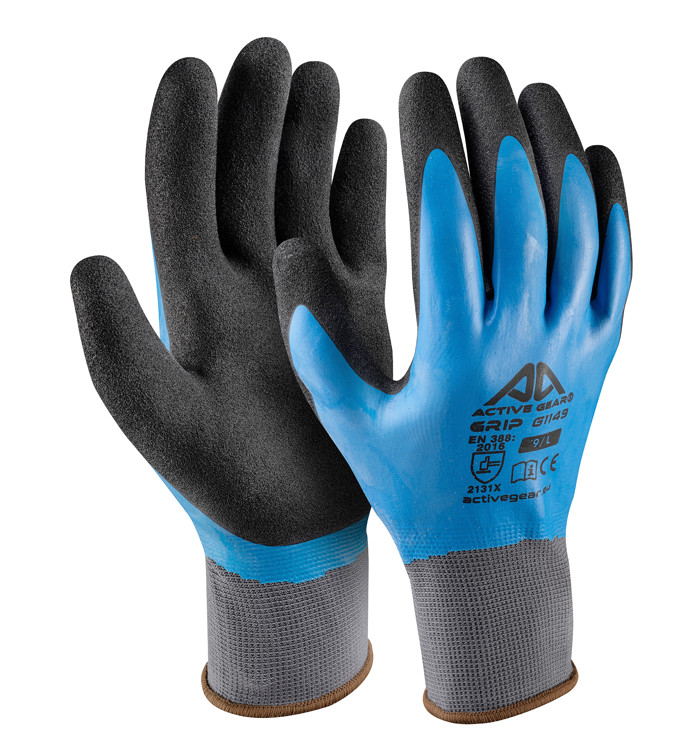 Guanti da lavoro ACTIVE GRIP G1150 di Active Gear SA, in poliestere senza cuciture, con doppio rivestimento in lattice per protezione da liquidi e una presa sicura anche su superfici bagnate. Comfort elevato grazie alla fodera senza cuciture e massima aderenza. Conformi agli standard EN 388:2016 e EN ISO 21420:2020, categoria di rischio intermedio (CAT. II), certificati CE. Disponibili in taglie XS-XXL, imballati singolarmente.