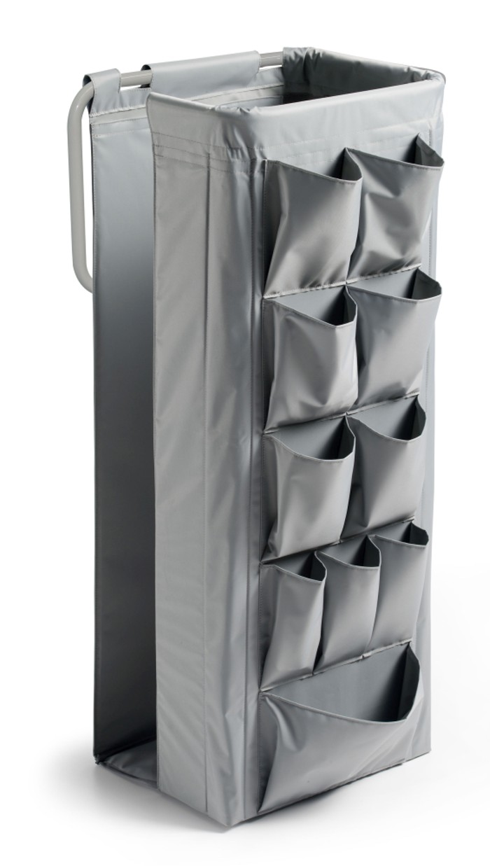 Il carrello Green Hotel portaccappatoio è realizzato in tessuto plastificato resistente, costituito per il 70 per cento da PVC e per il 30 per cento da poliammide. Dotato di tasche pratiche e di due giunti per il fissaggio sicuro ai carrelli della linea Green Hotel, risulta perfetto per contenere accappatoi e asciugamani. Le sue dimensioni compatte di 45x30x90 centimetri lo rendono funzionale e versatile allinterno delle strutture ricettive moderne.