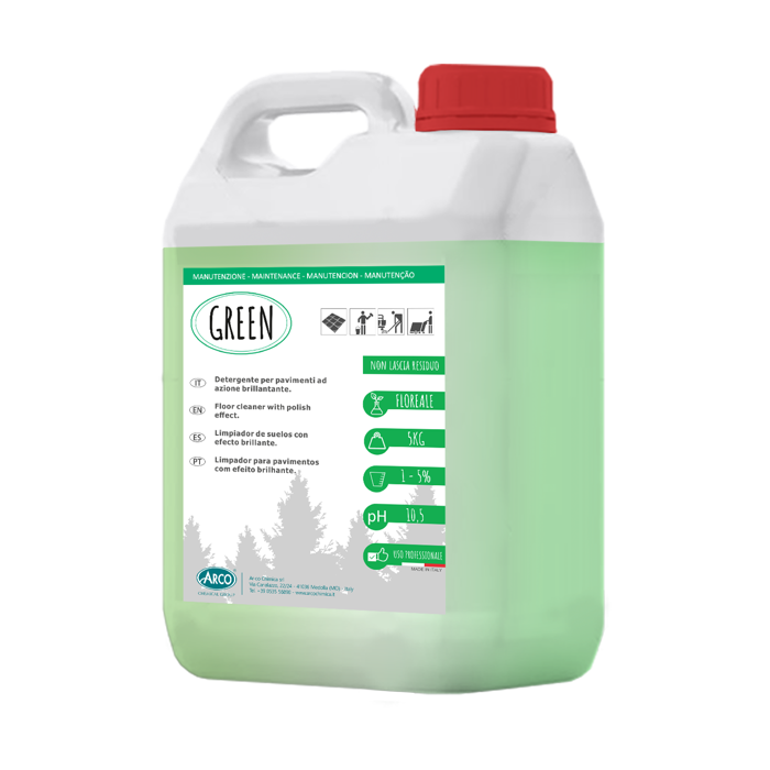 GREEN è il detergente brillantante profumato alle essenze floreali, ideale per la pulizia quotidiana di pavimenti e tutte le superfici lavabili. Raccomandato per la manutenzione giornaliera di superfici lucide come ceramica o pavimenti trattati con emulsioni polimeriche. Garantisce un effetto antistatico e lascia un fresco aroma persistente nell’ambiente, contribuendo al benessere degli spazi professionali. Uso professionale. Tanica da 5 kg.