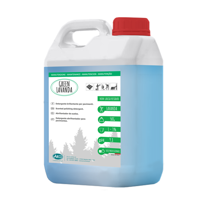 Green Lavanda tanica 5 kg è un detergente brillantante alla lavanda per la pulizia quotidiana di pavimenti e superfici lavabili. Particolarmente indicato per superfici lucide e pavimenti protetti con emulsioni polimeriche, lascia un persistente profumo fresco e favorisce il fissaggio della polvere grazie all’effetto antistatico. Ideale per uso professionale, si diluisce facilmente e mantiene salubri e brillanti gli ambienti.