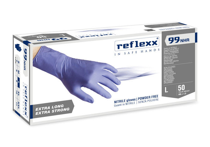 Guanti monouso Reflexx 99 NHR in nitrile ad alto spessore, indicati per usi gravosi grazie alla notevole resistenza meccanica. Latex Free e Thiuram Free, sono ideali anche in caso di allergie alla gomma. Finitura microruvida per una presa sicura, senza polvere, lunghezza extra da 29 cm. Adatti al settore alimentare, come Dispositivo Medico e DPI Cat. III. Disponibili in diverse misure, confezione da 50 pezzi colore indaco.