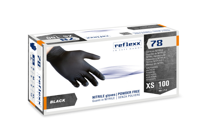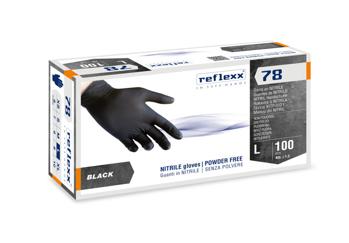 Guanti in nitrile Reflexx 78, monouso e privi di polvere, ideali per chi necessita di sensibilità e resistenza. Ambidestri, dalla superficie microruvida, assicurano una presa stabile e comfort anche per pelli delicate. Indicato per ambienti ospedalieri, laboratori, settore alimentare e industriale. Non sterili, latex free e internamente clorinati. Colore nero, idonei al contatto con diversi tipi di alimenti. Confezione da 100 pezzi.