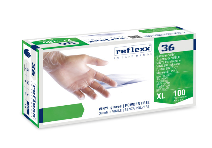 Guanti monouso in vinile senza polvere Reflexx 36, ideali per pelli sensibili grazie all’assenza di talcatura e lattice. Ambidestri e trasparenti, sono dotati di superficie liscia e certificati sia come DPI Cat. III che come Dispositivo Medico. Idonei al contatto con vari alimenti, assicurano praticità e protezione da virus e microrganismi, nel pieno rispetto delle normative europee. Confezione da 100 pezzi.