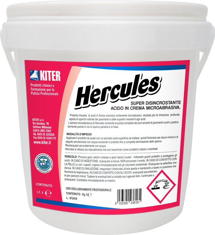 HERCULES è un sgrassante trifasico superpotente in crema, ideale per rimuovere incrostazioni, calcare e sporchi ostinati sia organici sia sintetici. Con azione microabrasiva e a bassa schiuma, si applica facilmente anche con lavasciuga su ceramica, gres, granito e cotto. Idoneo per ambienti professionali come officine o centri sportivi, garantisce una pulizia profonda e rapida, rispettando i requisiti di biodegradabilità.