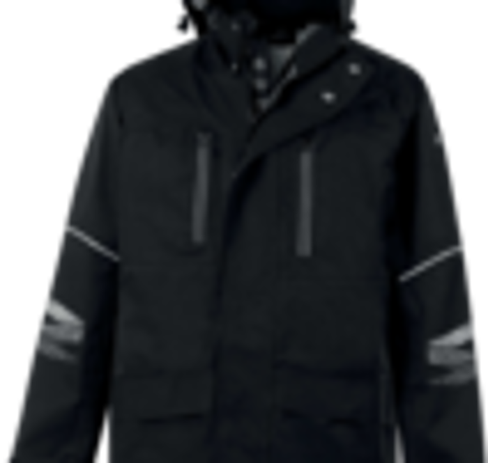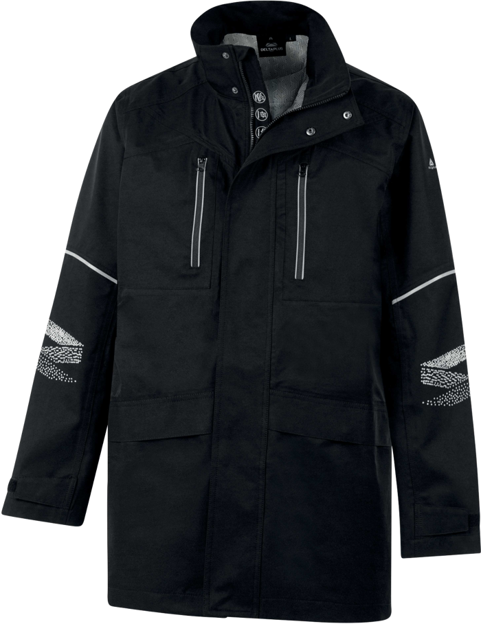 Parka 5 in 1 ideale per lavori pubblici, edilizia ed eventi, realizzato in poliestere riciclato e dotato di membrana in grafene impermeabile e traspirante. Colore nero, design unisex, con cappuccio e fodera removibile, garantisce protezione in qualsiasi stagione. Le cuciture impermeabili, i dettagli riflettenti e il comfort leggero lo rendono perfetto per affrontare condizioni avverse, assicurando visibilità e igiene grazie all'azione antibatterica.