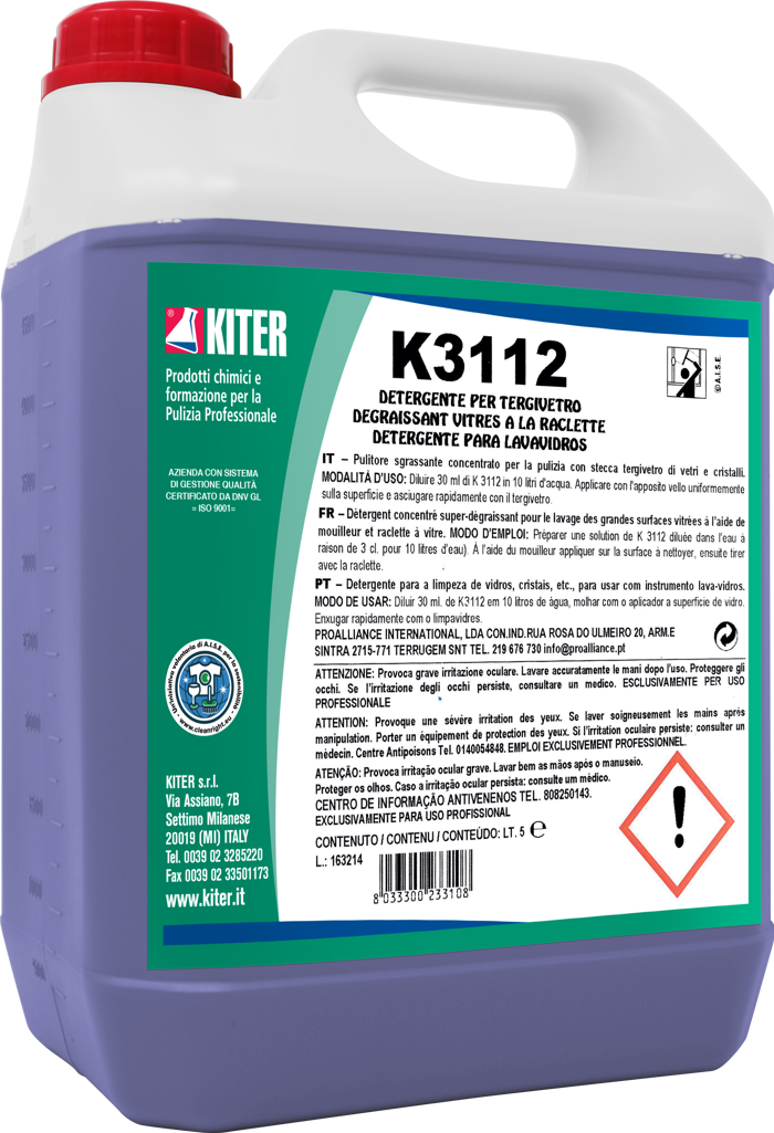 K3112 è un detergente concentrato per vetri e cristalli, ideale per l’uso con tergivetro. Migliora lo scorrimento della gomma, rimuove lo sporco e lascia le superfici brillanti, senza aloni. Indicato per ampie vetrate e vetri di veicoli, può essere utilizzato sia manualmente sia nella vaschetta lavavetri. Profuma di limone, è facilmente diluibile e i tensioattivi sono conformi alle normative europee. Destinato esclusivamente a uso professionale.