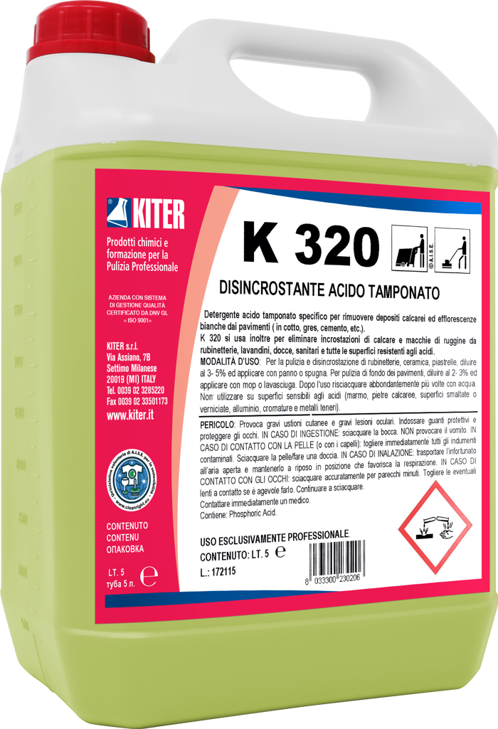 K320 è un detergente disincrostante acido tamponato a base di acido fosforico, specifico per il lavaggio di gres, ceramiche, sanitari, piastrelle smaltate e piscine. Rimuove efficacemente calcare, cemento, salnitro e residui difficili da superfici resistenti agli acidi. Ideale per manutenzione e pulizia di fondo, si utilizza diluito, con macchina o manualmente. Solo per uso professionale. Profumazione al pino.