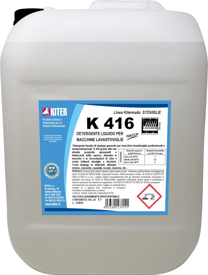 Il detergente concentrato per lavastoviglie professionali K 416 è una soluzione liquida di elevata efficacia, ideale per ristoranti, alberghi e mense. Grazie alla formulazione specifica, deterge in profondità stoviglie, posate e bicchieri, rimuovendo anche i residui più ostinati. Il prodotto è trasparente incolore, inodore e completamente solubile in acqua. Adatto esclusivamente a uso professionale, garantisce igiene e brillantezza a ogni ciclo di lavaggio.