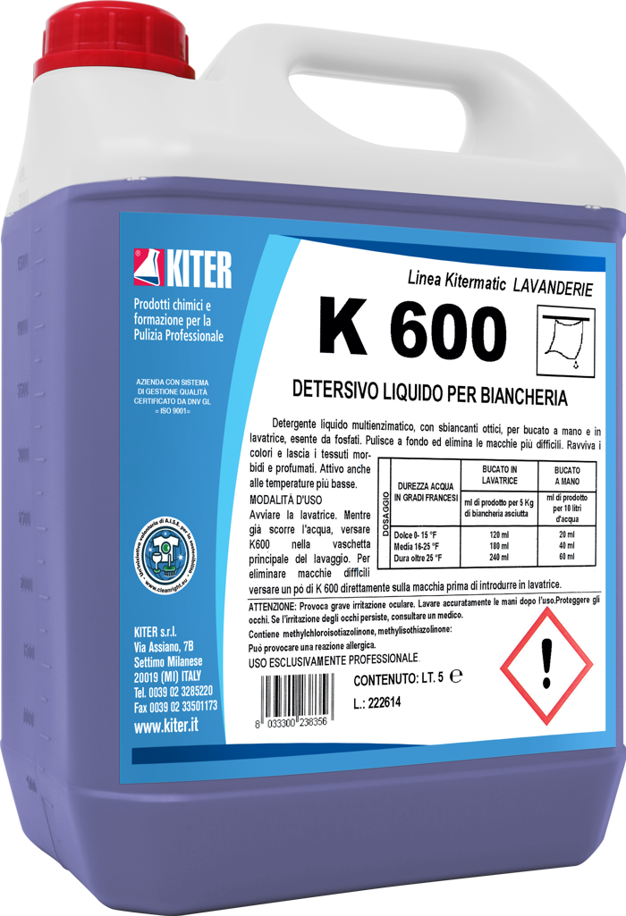 K600 è un detergente liquido multi-enzimatico ideale per bucato a mano e in lavatrice. La sua formula ecologica senza fosfati deterge con efficacia già a basse temperature, elimina le macchie più ostinate e ravviva i colori. Ammorbidisce e profuma i tessuti, riducendo residui e incrostazioni in lavatrice. Rapida solubilità e facile dosaggio, può essere usato anche puro per pretrattare. Solo per uso professionale.