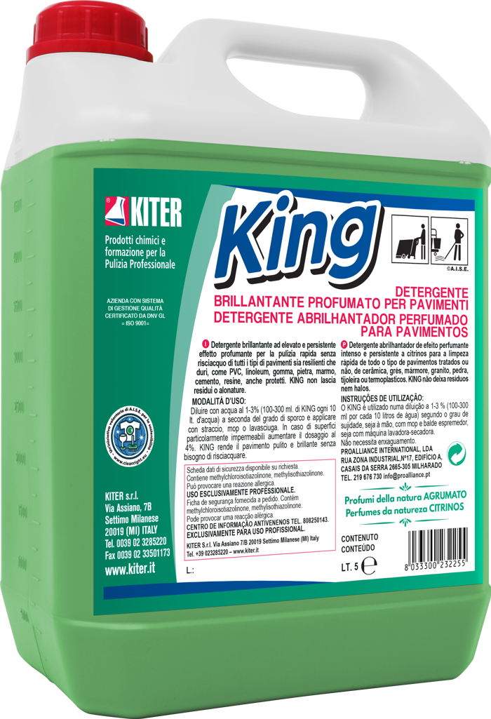 Detergente neutro KING tanica da 5 litri, ideale per la pulizia quotidiana di tutti i pavimenti lavabili come PVC, linoleum, marmo, resina e cemento. Non necessita risciacquo, non lascia aloni né residui e garantisce una brillantezza duratura. Profumazione intensa e persistente agli agrumi che rende gli ambienti freschi e gradevoli. Adatto a uso professionale, può essere utilizzato con mop o lavasciuga. Solubile in acqua, conforme alle normative europee.