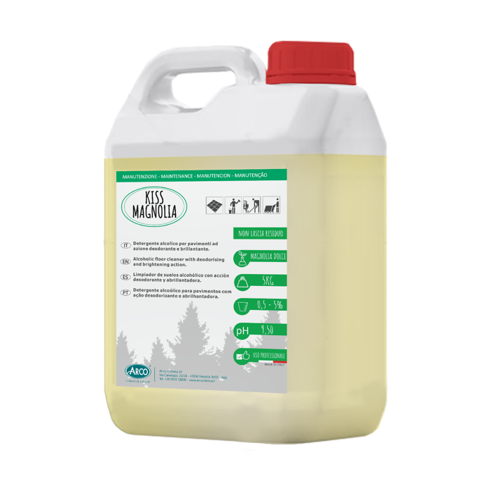 KISS MAGNOLIA è un detergente alcolico deodorante e lucidante, specifico per manutenzione giornaliera di pavimenti lucidi come ceramica, gres porcellanato, marmo e parquet verniciato. Non lascia residui e si distingue per la profumazione di magnolia. Ideale per l’ambiente professionale, va diluito dallo 0,5 al 3%. Consigliato per uso manuale o con lavasciuga. Consultare la scheda di sicurezza prima dell’uso.