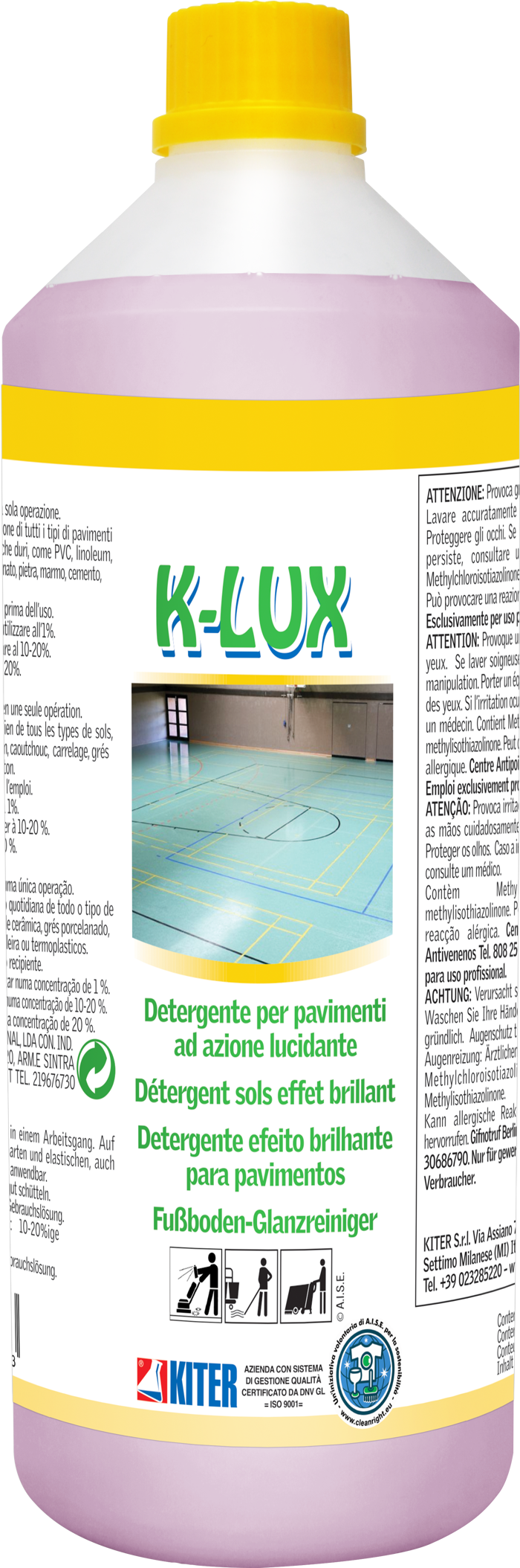 K-LUX è un detergente professionale per pavimenti a bassa schiuma con doppio effetto lucidante e antiscivolo. Ideale per superfici resilienti, gres, marmo e pavimenti sportivi, pulisce e dona brillantezza senza lasciare aloni. L’uso costante mantiene la protezione dei trattamenti esistenti e rallenta la rideposizione dello sporco. Utilizzabile sia a mano sia con macchinari, non richiede risciacquo. Solo per uso professionale.