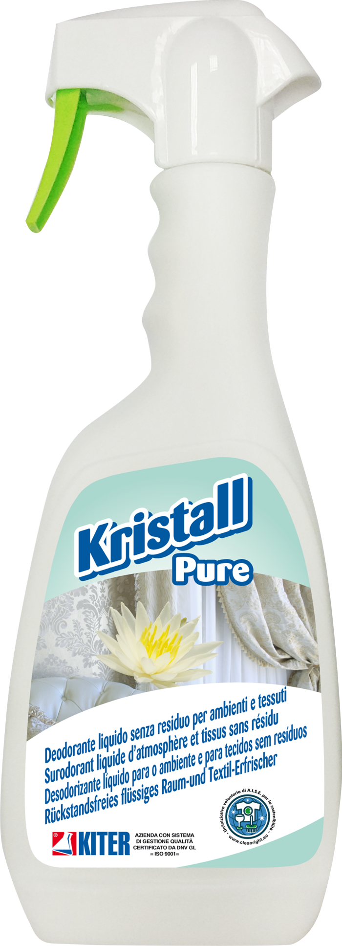 Kristall Pure è un deodorante liquido ultraconcentrato specifico per ambienti e tessuti. Dona una nota persistente di fiori bianchi e sandalo senza lasciare residui su superfici o tessuti. Può essere utilizzato su tendaggi, tappeti, copriletti e negli spazi comuni grazie alla micro-nebulizzazione, garantendo una diffusione omogenea. Destinato esclusivamente a uso professionale. Conservare lontano da fonti di calore.