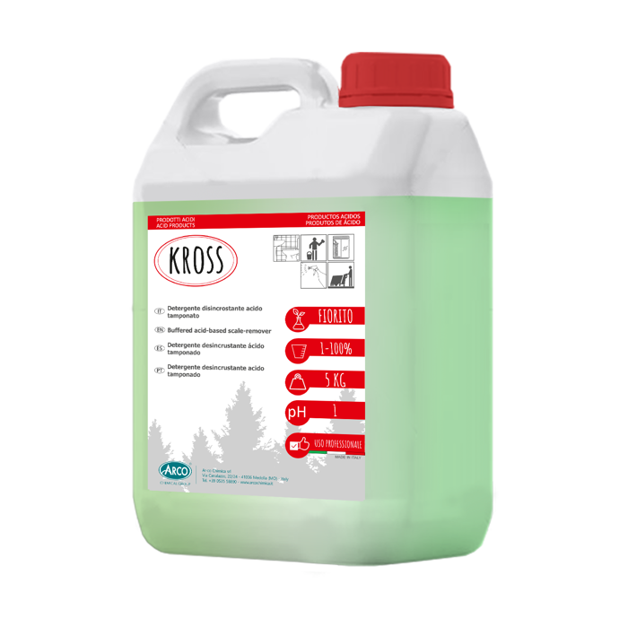 KROSS è un detergente disincrostante professionale a base di acido solfammico, efficace nella rimozione di calcare e ruggine da superfici dure. Grazie ai tensioattivi, elimina lo sporco da pavimenti in ceramica e sanitari, rigenera le cromature di rubinetteria e sbianca marmo, terrazzi e balconi. Ideale per l’utilizzo manuale o con lavasciuga, ha una profumazione floreale delicata. Formato tanica da 5 kg.