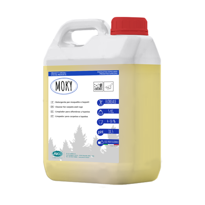 MOKY è un detergente liquido professionale per la pulizia profonda di moquette e tappeti, ideale per l’uso con macchine a iniezione/estrazione. Garantisce efficacia e freschezza grazie alla sua profumazione bouquet fiorito. Adatto per superfici tessili, va utilizzato previa diluizione secondo istruzioni. Formato da 5 kg. Consultare la scheda di sicurezza prima dell’uso. Solo per applicazioni professionali.