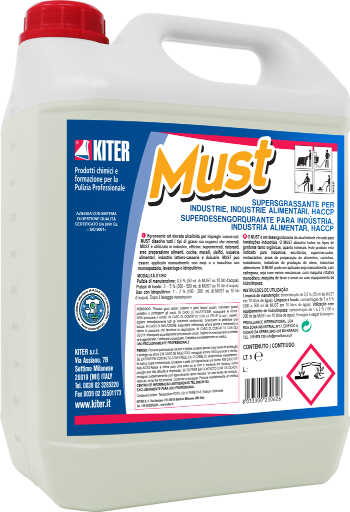 MUST 5 kg è uno sgrassatore professionale ad alta alcalinità, studiato per industrie alimentari e ambiti HACCP. Efficace contro grassi organici e minerali, rapido nell’azione, indicato per pulizie di fondo e manutenzione di grandi superfici. Non genera schiuma, si utilizza sia manualmente sia con macchine. Adatto a marmo, gres, cemento, acciaio. Si consiglia l’uso di DPI durante l’applicazione. Prodotto concentrato, biodegradabile secondo normativa UE.