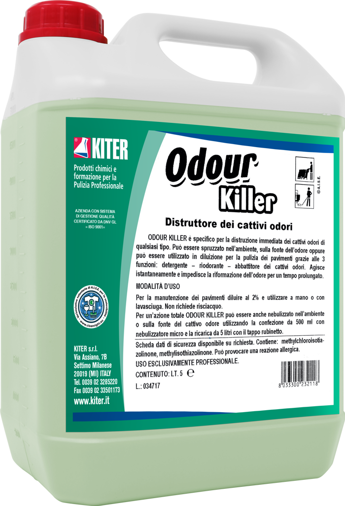 Odour Killer Kiter in tanica da 5 litri è un distruttore di cattivi odori a effetto rapido, indicato per uso professionale in ambienti come bagni, cucine, ristoranti, comunità e lavanderie. Agisce eliminando istantaneamente le molecole responsabili degli odori, lasciando una fresca profumazione e prevenendo la ricomparsa. Non lascia residui, è facilmente diluibile ed è sicuro su molte superfici, inclusi tessuti e pavimenti.
