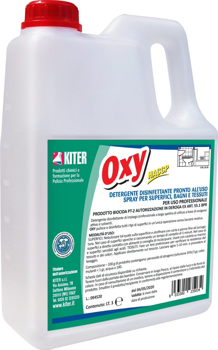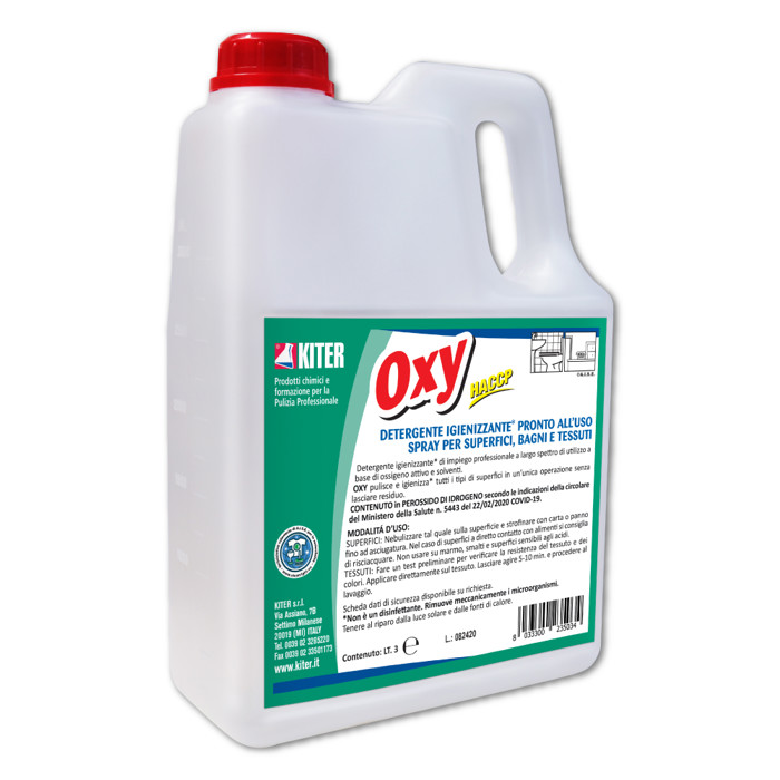 OXY è un detergente igienizzante pronto all’uso a base di perossido di idrogeno, pensato per superfici lavabili e tessuti. Rimuove i microrganismi meccanicamente, senza lasciare residui né profumazione. Adatto per ambienti professionali e HACCP, è ideale in scuole, uffici, industrie, trasporti e sanità. Sicuro, non infiammabile, facilmente biodegradabile e pratico per la pulizia quotidiana, si utilizza direttamente sulle superfici o con nebulizzatore.