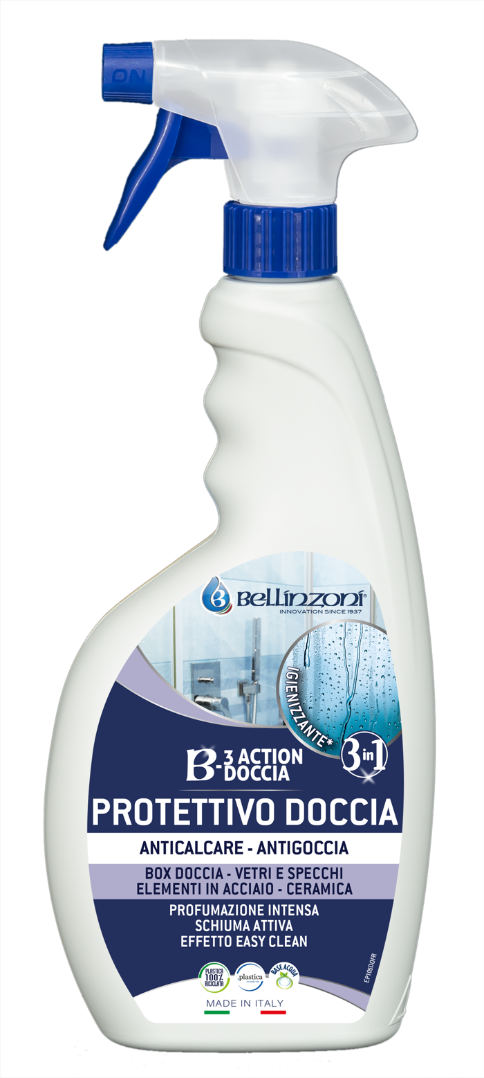 B-3 ACTION DOCCIA 750 ml è il detergente protettivo ideale per la pulizia di box doccia, vetri e rubinetteria. Grazie alla sua formula a tripla azione rimuove residui di calcare e sapone, donando brillantezza. Applicato regolarmente offre uno scorrimento ottimale dell’acqua e contrasta la formazione di tracce di calcare. Adatto su acciaio, ceramica e superfici in vetro, regala una profumazione intensa e garantisce risultati professionali nel rispetto delle superfici trattate.
