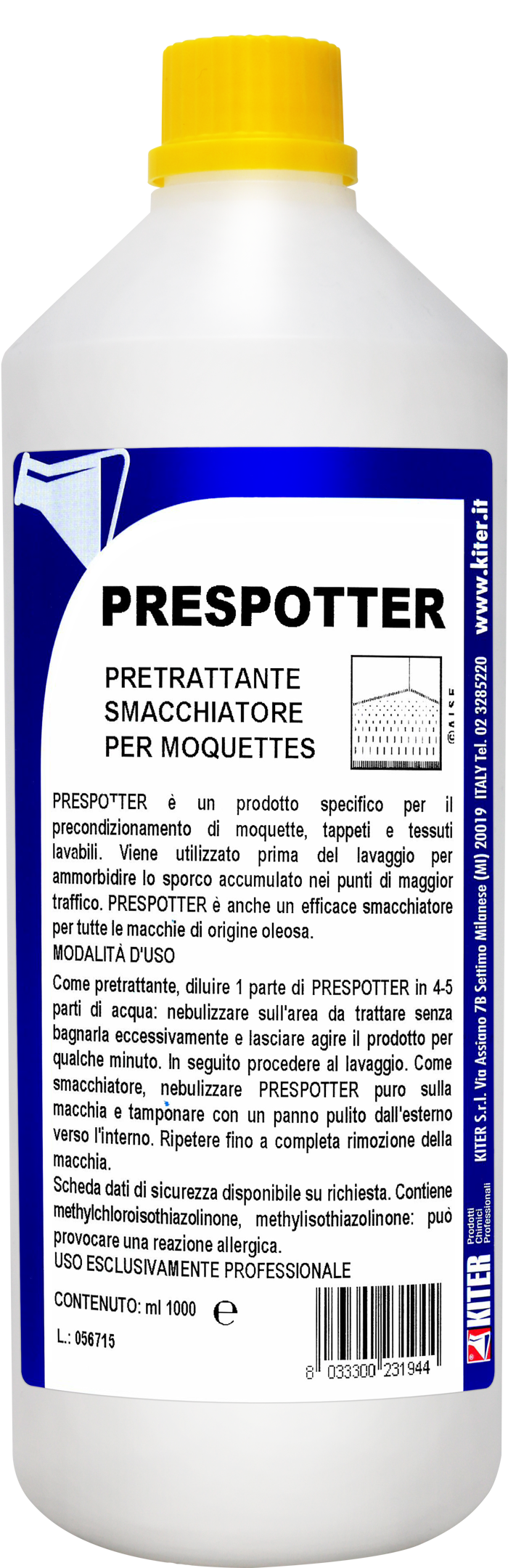 PRESPOTTER è un pretrattante liquido pronto all’uso studiato per moquettes, tappeti e tessuti. Ammorbidisce lo sporco e facilita la pulizia, senza lasciare residui. Si utilizza diluito per il prelavaggio o puro come smacchiatore, rispettando i colori e conservando l’aspetto originario delle superfici. Il prodotto è conforme ai requisiti di biodegradabilità e indicato solo per uso professionale.