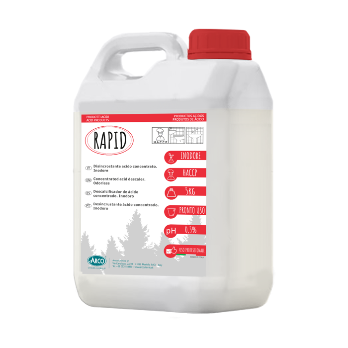 RAPID tanica 5 kg è un disincrostante acido inodore a base di acido fosforico, consigliato per eliminare residui calcarei e organici da sanitari, macchine da caffè e pentolame in acciaio o alluminio. Il prodotto, idoneo per ambienti HACCP e utilizzi professionali, agisce rapidamente senza lasciare odori. Va applicato puro o diluito, lasciando agire e risciacquando con cura. Consultare la scheda di sicurezza prima dell’uso.